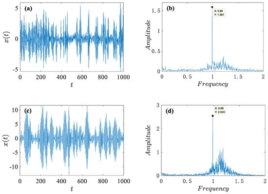 Select and , the simulation of discrete algorithm (51) for the output signal of the system under different intensity of nonlinear trichotomous noise are shown in Figure 16. Time domain and frequency domain simulation results is displayed for the first s, with parameters , , , , , , , , , . By comparing (a) and (c), it can be seen that larger noise intensity does not drive the system to output signals with larger amplitude, and the results of show stronger periodic characteristics than those of . (b) and (d) show the amplitude of the system output signal at each frequency, and it is found that it peaks at the external excitation frequency in both cases. In the case of and , the numerical results of the amplitude at the external excitation frequency are and , respectively, and the theoretical results obtained by the analytical expression (35) are and , respectively, fully showing that the numerical results of a single sample are quite close to the theoretical prediction results.