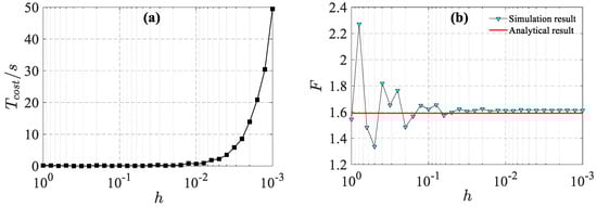 Firstly, examining the influence of time step on the time consumption of the program, fix , and select step in the range . The average time of 1000 Monte Carlo experiments using algorithm (651) was recorded, and results under different time steps are shown in Figure 17a. The time consuming increases exponentially with the decrease in the time step , and the approximate fitting relationship reads , the calculation time of a single sample increases greatly especially for , which is bound to lead to a sharp increase in the experimental time of a large number of independent samples. In order to verify the convergence of numerical simulation algorithms (51) and (53), taking the output amplitude as a function of , the simulation results based on (53) and theoretical results based on (35) are compared in Figure 17b. When decreases, the numerical simulation amplitude gradually approaches the theoretical result , and tends to 1.603 without significant fluctuation when , the inherent error is caused by the numerical discretization of the fractional system (12). Numerical results are no longer significantly affected by step size when , so time step is selected in the following part.