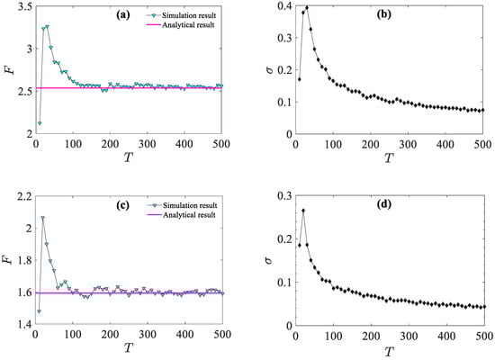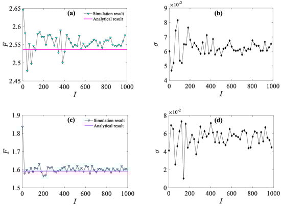 In virtue of (54), the mean square error of simulation results corresponding to and are given in Figure 18b,d, respectively. It is found that the mean square error tends to be stable with the increase in simulation time, for and for , which reflects the reliability of the algorithm (51). Under the same parameter conditions, the influence of the number of the Monte Carlo experiment on the steady-state output amplitude and mean square error was investigated, and the simulation time was fixed . Comparison between (Figure 19a,b) and (Figure 19c,d) shows that, when the number of experimental samples is large enough, the simulated output amplitude oscillates within a small range of the theoretical one, and the mean square error is around , which indicates that the algorithm in this paper (51) is basically consistent with the theoretical analysis result given by (35).