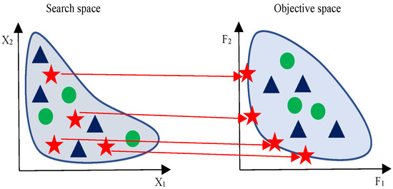 In such multi-objective optimization problem, a solution is the set of best non-dominated solutions. Therefore, the Pareto optimal solutions projection in the objective space are kept in a set called Pareto optimal front as illustrated in Figure 1. The solutions of both spaces obviously reveal that the green shapes are better than the others, since they dominate all other colors.