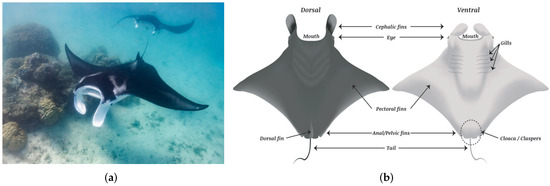 Manta ray body form. (a) Manta ray in the ocean; (b) parts of a manta ray, dorsal, and ventral.