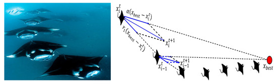 In this foraging strategy, about 50 Mantas line up head to tail forming an orderly line. The chain swims towards the position of intense concentration of plankton with a fully open mouth. The missing plankton by the leader (manta at the top of the chain) will be devoured by the followers. In the course of the foraging process, the position of each follower is updated towards the best source of plankton and individuals in front of it. This foraging phase is depicted in Figure 3. The mathematical updating formulas are presented as follows: