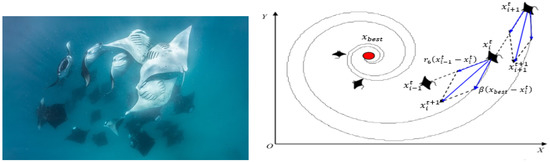 Cyclone foraging phase follows the feeding strategy in WOA [39] in terms of spiral movement. After discovering a significant amount of plankton in the profundity of the ocean, the mantas move one behind another towards plankton making a spiral shape. This foraging phase is illustrated in Figure 4. The manta updates its position based on its best previous position and the manta in front of it.