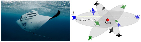 MRFO is among the recent algorithms proposed in 2020, inspired by giant known critters of the sea called Manta Rays [19]. Figure 2 depicts the shape of a manta ray. To establish this algorithm, the authors mimic three feeding behaviors of Manta Rays: chain, somersault, and cyclone feeding. Furthermore, the manta rays are assumed as search agents which explore the planktons’ location and proceed towards them. Then, the planktons at significant concentration represent the best solution. The source code of MRFO is given in https://www.mathworks.com/matlabcentral/fileexchange/73130-manta-ray-foraging-optimization-mrfo (accessed on 24 May 2021).