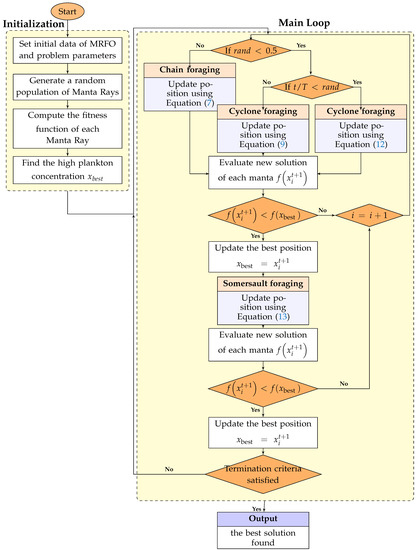 MRFO’s diversification and intensification phases are balanced using the variations value , which is gradually increased. The expression denotes the exploration stage, reversibly, and the exploitation process is adopted. The main steps followed in MRFO are demonstrated in Figure 6.