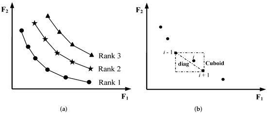 As MRFO is relevant for single objective issues, we have developed a multi-objective version of MRFO to handle problems with many fitness functions by applying the Pareto dominance strategy. This variant is inspired from the non-dominated sorting genetic algorithm (NSGA-II) approach, which is the most popular and efficient algorithm in the area of multi-objective optimization in the literature. The non-dominated sorting (NDS) technique employs the crowding distance to define an ordering among individuals and preserve the diversity and the elitist mechanism. To compute all non-dominated solutions, a ranking process is applied called non-dominated ranking (NDR), in which the front that is not dominated by any solutions is assigned to rank 1, while rank 2 is in accordance with the front that is dominated by at least one of the solutions, and so on; the ranking scheme is described in Figure 7a. The crowding distance value of a particular solution is the average distance of its two neighboring solutions as illustrated in Figure 7b. Therefore, the less value of crowding distance denotes comparatively the higher crowded space and conversely. The formulation of this crowding distance mechanism is defined as below: