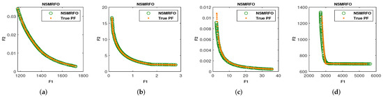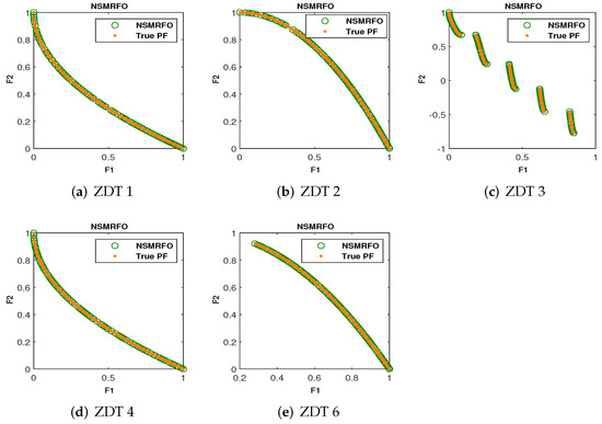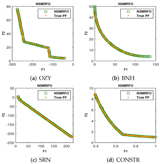 It is worth discussing here that the (NDS) provides a probability to the dominated solutions to be chosen as well, which enhances the diversification of the suggested algorithm. The pseudo-code of NSMRFO is depicted in Algorithm 1. The computational space complexity of NSMRFO is the same as NSGA-II of the order of , where M is the number of objectives, and N is the number of manta rays, while the computational complexity was found to be much better than that of some of the approaches such as SPEA and NSGA, which are of .