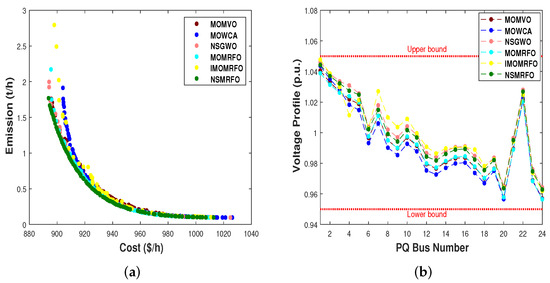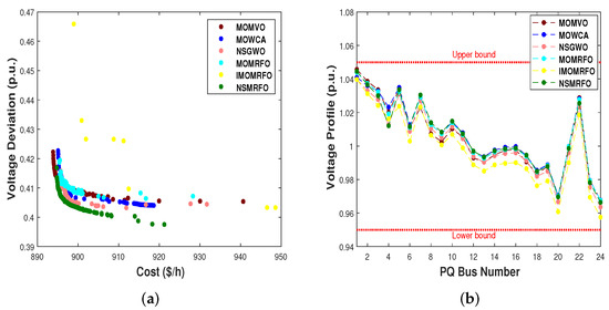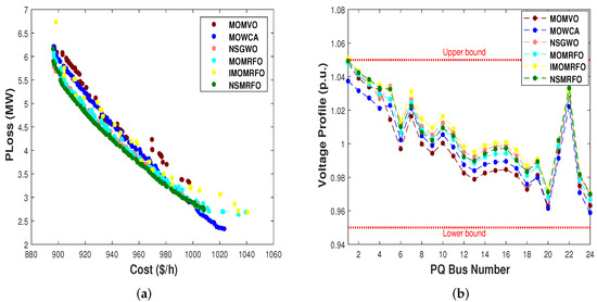 The optimum settings of the control variables, their allowable ranges, the numerical best outcomes of each objective, and the best compromise solutions (BCS) are depicted in Table 10, Table 11, Table 12, Table 13, Table 14 and Table 15. Furthermore, their optimal Pareto fronts are illustrated in Figure 14a–Figure 16a. It is worth noting that all the findings are generated after twenty independent runs for a population size of 100 and 200 iterations. According to the aforementioned tables, it is obviously seen that the NSMRFO’ results are remarkably better than the competitor approaches in all cases, notably the best compromise solutions’ tables. In addition, it is clearly observed from the figures that the suggested NSMRFO can generate the superior Pareto non-dominated solutions with good distribution and good diversification front in comparison to other algorithms. As shown in Figure 14b–Figure 16b, the BCS’ voltage profile PQ of load buses do not exceed their limits, and remained within the minimum and maximum bounds.