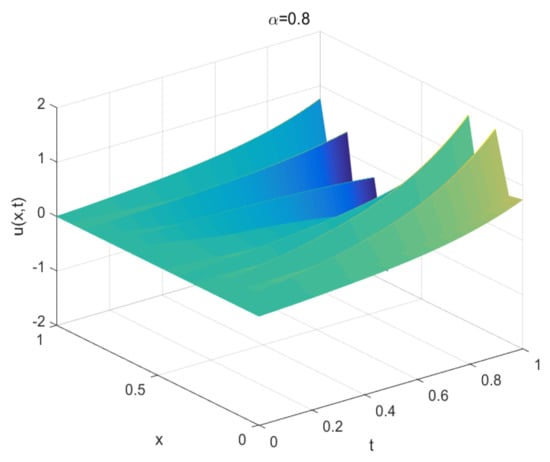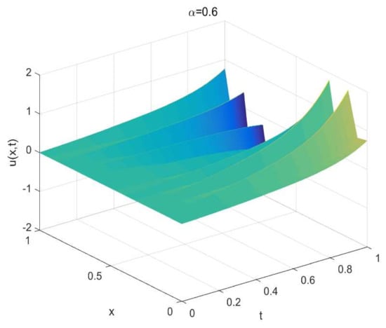The numerical solution the scheme (18) for Example 1 with , , , and .