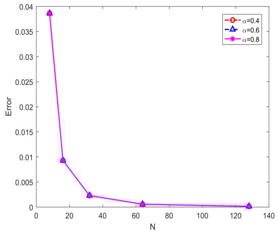 To solve Example 1, we apply the nonuniform L1βLDG scheme (18) with in computation. The -norm errors and temporal convergence orders of the numerical solution for and different time-steps are listed in Table 1. The convergence orders of and are close to , which is consistent with the theoretical prediction in Theorem 2. However, the accuracy of is slightly lower. In Table 2 and Table 3, for fixed and , we observe that the spatial convergence order for (18) is , which is in agreement with the theoretical analysis. The numerical solutions of the scheme (18) for different are given in Figure 1, Figure 2 and Figure 3. Figure 4 depicts the -norm errors versus N between the numerical solution and the exact solution for different at . The graphs show good agreement between the two solutions.