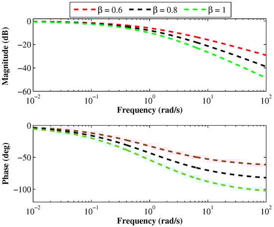 Magnitude and phase responses of the theoretical FLPF for different values of with .