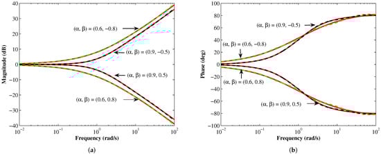 (a) Magnitude and (b) phase responses of the proposed FBSFs and FIBSFs for . The theoretical response is shown in solid red.