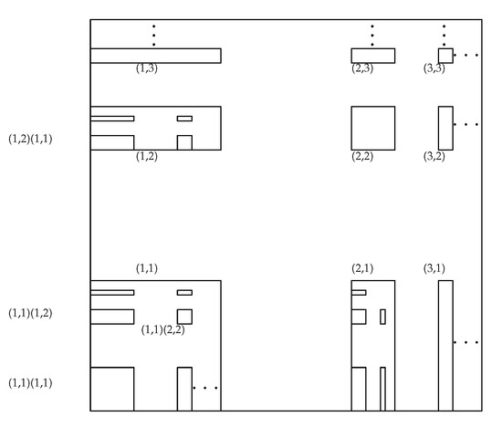 In particular, the identity mapping on and . Then, the probability measure P supports the closure of the limit set , where . The limit set is called the affine set or infinitely generated affine set. For and , the rectangles , into which is split up at the th level are called the children or the basic rectangles of (see Figure 1). For , we write