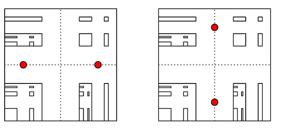 In the affine set, among all the oblique lines that pass through the point , the line has the maximum symmetry, i.e., with respect to the line the affine set is geometrically symmetrical. Also, observe that, if two basic rectangles of similar geometrical shape lie in the opposite sides of the line , and are equidistant from the line , then they have the same probability (see Figure 1); hence, they are symmetrical with respect to the probability distribution P. Due to this, among all the pairs of two points which have the boundaries of the Voronoi regions oblique lines passing through the point , the two points which have the boundary of the Voronoi regions the line will give the smallest distortion error. Again, we know the two points which give the smallest distortion error are the centroids of their own Voronoi regions. Let and be the centroids of the left half and the right half of the affine set with respect to the line respectively. Then, from the definition of conditional expectation, we have