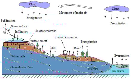 The phenomenon of the model is schematically shown in Figure 1, where different conditions, mechanisms, and major pathways for contaminant transport may vary in the saturated and unsaturated zone. The subterranean environment, which lies between the groundwater and the land surface, is included in the unsaturated zone. The unsaturated zone is the first subterranean habitat to be impacted by pollutants generated by human activity. The existence of a gas–water interface, oxygen, comparatively high microbial activity, and large amounts of particulate organic matter characterize the unsaturated zone in general. Chemical conditions fluctuate significantly with place and time due to dilution through concentration or rainwater, evaporation, and large vertical and horizontal variations in the solid phase composition. Contaminant transportation in the unsaturated zone will be vertical. Generally, the saturated zone is characterized by much lower oxygen content, much lower organic matter contents, and a lesser absorption capacity of the solid phase. Chemical circumstances in the unsaturated zone, on the other hand, will be less variable in space and time as the impact of evapotranspiration and dilution will be minimal. Contaminant transportation will be mainly horizontal in the saturated zone and is important for the transport of inorganic contaminants. The water saturates almost all fractures and holes in the saturated zone. The pore space in the unsaturated zone is partially filled by water and partially by air. The subsurface between the groundwater table and the ground surface is part of the unsaturated zone.