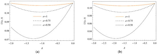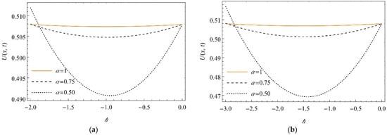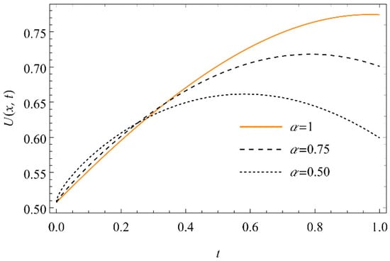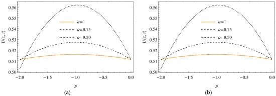 We performed numerical simulations for different forms of fractional Richard’s equation (Equations (12)–(14)) by using an adequate hybrid analytical technique, q-HATM. The graphs of obtained solutions are plotted for different values of α and t. Table 1, Table 2 and Table 3 depict the values of the moisture content U(x,t) for different values of x and t at n = 1, α = 1, and ℏ = −0.1. The surface plots of the moisture content versus depth x and time t for Equation (29) is presented in Figure 2. The 2D plots of the moisture content U(x,t) versus depth x for Equation (29) at various values of t and α are obtained and cited in Figure 3 and Figure 4. The plot of acquired solution versus auxiliary parameter is shown in Figure 5. Figure 6 shows that the U(x,t), for example (29), increases with increase in time . The density plot showing the moisture content distribution over the region is presented in Figure 7. The 3D plots of the moisture content versus depth x and time t for Equation (37) are presented in Figure 8. The 2D plots of the moisture content U(x,t) versus depth x for Equation (37) at various values of t and α are obtained and cited in Figure 9 and Figure 10. ℏ-curves with different fractional order , for example (37), are presented in Figure 11. Figure 12 shows that the U(x,t), for example (37), increases with increase in time for α = 1, 0.75, and 0.50. The density plot showing the moisture content distribution over the region is presented in Figure 13. The surface plots of the moisture content versus depth x and time t for Equation (45) is presented in Figure 14. The 2D plots of the moisture content U(x,t) versus depth x for Equation (45) at various values of t and α are obtained and cited in Figure 15 and Figure 16, respectively. ℏ-curves with different fractional order , for example (45), are presented in Figure 17. Figure 18 shows that the U(x,t), for example (45), increases with increase in time . The moisture content distribution over the region is represented by the density plot in Figure 19.