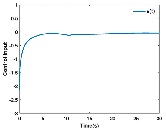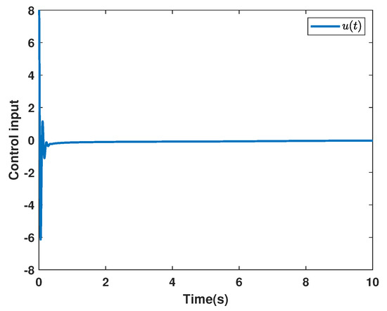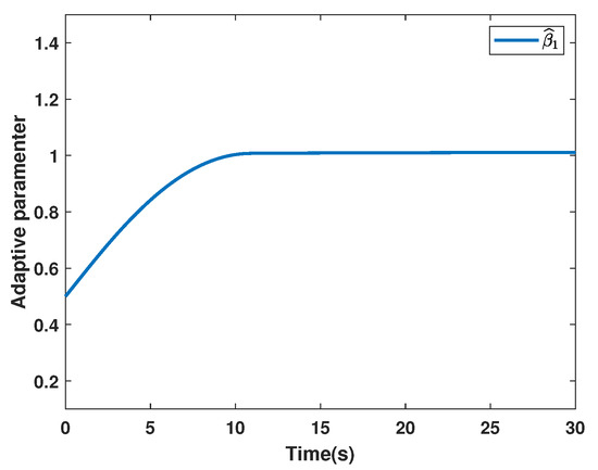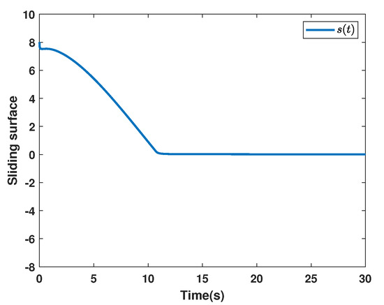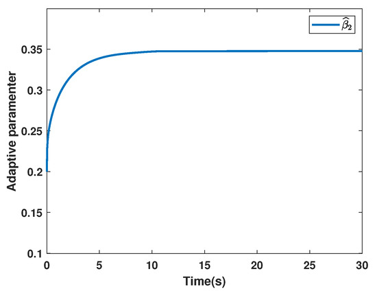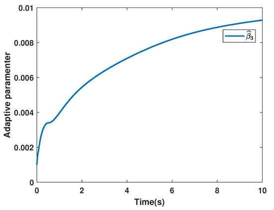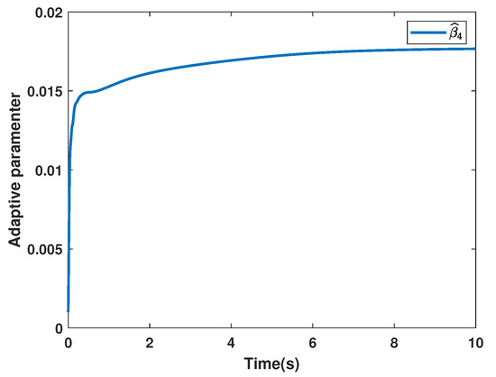 and the initial estimates are given as . The system state of System (3) is given in Figure 8. The sliding function is presented in Figure 9, and the control input is shown in Figure 10. The adaptive parameters are depicted in Figure 11, Figure 12 and Figure 13.