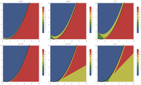 Number of equilibrium states in the parametric plane for different values of the parameter .