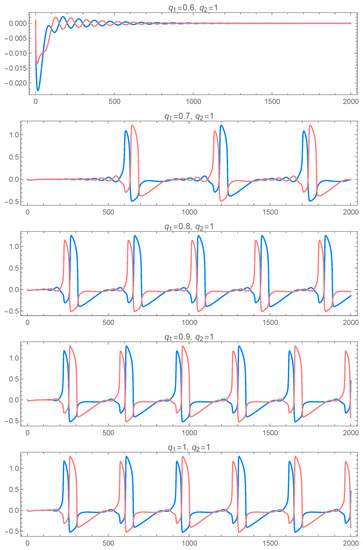 In contrast with the classical integer-order case, it may be observed from Figure 2 that as the fractional order decreases from 1 to , single high-amplitude spikes alternate with small-amplitude oscillations, which do not fully decay to a quiescent phase. This remarkable difference between the integer-order and fractional-order models provides insight into the complex dynamics exhibited by systems of coupled neurons, and justifies a thorough further study of the different oscillatory patterns induced by the fractional orders.