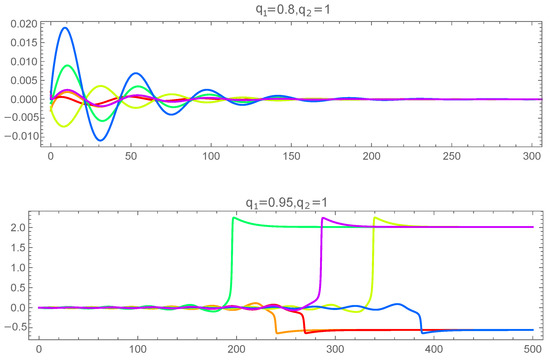 The parameters given by Proposition 3 are: and . Therefore, as for the first pair of asymmetric equilibrium states, we deduce that they are asymptotically stable, regardless of the fractional orders chosen in system (3). On the other hand, as for the second pair of asymmetric equilibrium states, it follows that they are unstable, regardless of the fractional orders chosen in system (3). However, as for the trivial equilibrium state, from Proposition 4, the stability of the trivial equilibrium depends on the choice of fractional orders.