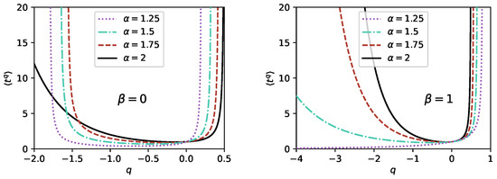 In Figure 3, we plot the fractional-order moments of symmetric () and the extremal two-sided () Lévy flights as functions of the parameter q for different values of the stable index . As can be seen, the PDFs are normalised, , but have diverging means for all .