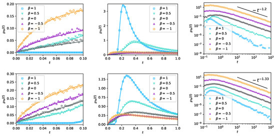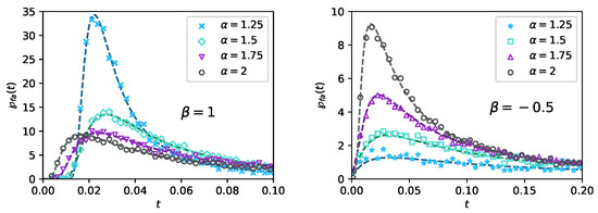 taken at times , , for more details, see [67]. The noise is computed according to the algorithm described in [82]. For each fixed value of , and , the random walker starts its motion at . When it hits the vicinity of the origin , the corresponding event time is recorded and a new particle is released. This procedure is repeated times. The time steps to determine the long-time and short-time behaviours of the first-arrival density were and , respectively. For the very short-time behaviour when we chose . While we study analytically a point-like target, in the simulations, we have to endow the target with a finite size d. This size should be sufficiently large to be detected by the simulated walk—and small enough to be considered as a point-like target and thus warrant proper statistics. This issue was discussed in detail in [9,54]. We find that the appropriate size of the target should be , as a function of the time step , stable index , asymmetry parameter and the generalised diffusion coefficient (see Equations (5) and (8)). Note that in contrast to the symmetric case studied in [9,54], here, the coefficient depends on both and , such that we should choose a smaller time step for simulations with closer to unity.