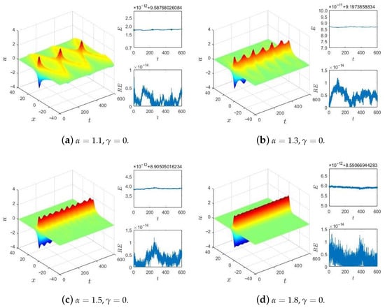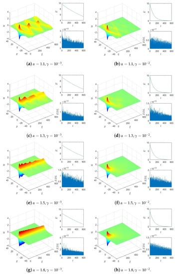 Besides, the surfaces of the numerical solutions with various γ are described in Figure 2. The numerical results show that the amplitude of solutions tends to decrease with reduced γ. Moreover, the dispersive effects of the parameter γ can also be observed in Figure 2. The smaller the values of γ, the smaller the rate of change of the discrete energy.