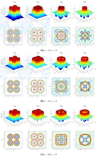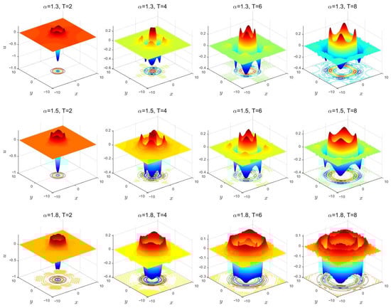 To consider the case of the collision of four ring solitons within the framework of the fractional sine-Gordon equation, we show the numerical solutions in terms of at different time T and the related contour of Example 3 in Figure 3 for , respectively. In Figure 3, we investigate the impact of the Riesz fractional order α on the surface evolution. These figures correctly characterize the collision of four expanding circular ring solitons. Moreover, they reflect the complex interaction with distinctly altering values of u in the center of the collision. These results coincide with the conclusions proposed in [,].