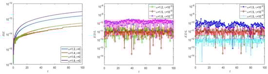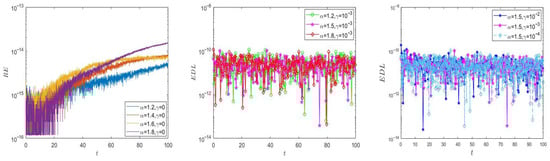 In Figure 6, we present the relative energy errors over a long time for different α and of Example 4 on domain with and , and the for several γ and α. It can be seen that and roughly reach the machine accuracy, which implies that the energy or dissipation-preserving law of Example 4 is conserved well by the present numerical method.