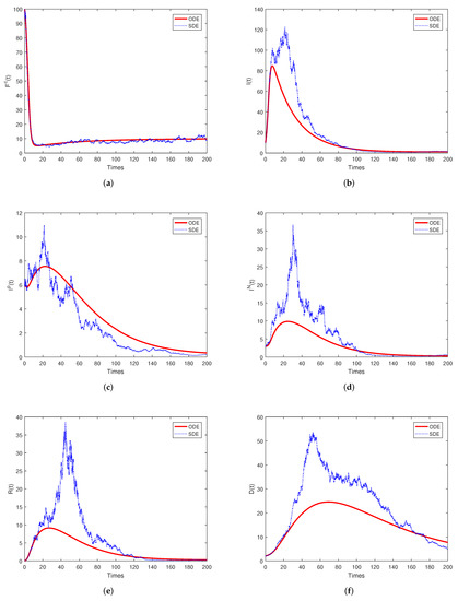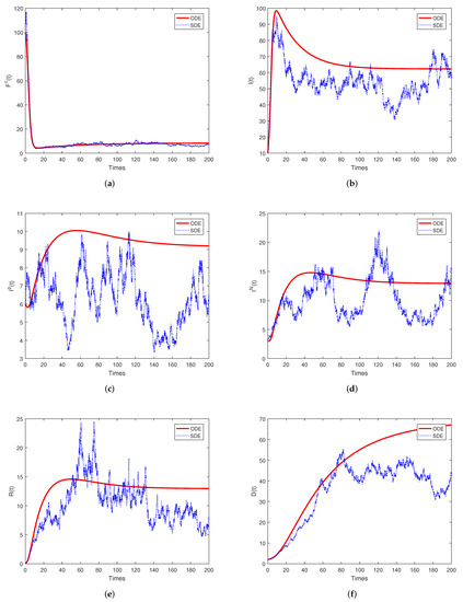 Simulations of for the stochastic model (1) with its corresponding deterministic version. (a) : researchers using fractional differential operators with non-singular kernels. (b) : researchers that have been affected by the harmful papers. (c) : researchers that have been affected, but still have positive opinions about non-singular kernel derivatives. (d) : researchers that have been affected and have negative opinions about non-singular kernel derivatives. (e) : researchers that have overcome divisive criticism. (f) : researchers that die, or retire.