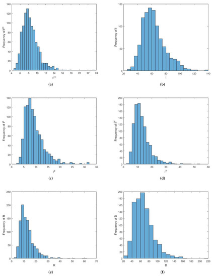 The probability distribution histogram of for the stochastic model (1). (a) : researchers using fractional differential operators with non-singular kernels. (b) : researchers that have been affected by the harmful papers. (c) : researchers that have been affected, but still have positive opinions about non-singular kernel derivatives. (d) : researchers that have been affected and have negative opinions about non-singular kernel derivatives. (e) : researchers that have overcome divisive criticism. (f) : researchers that die, or retire.