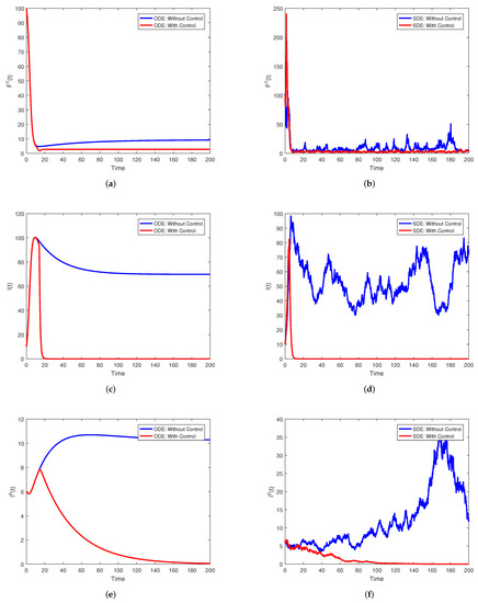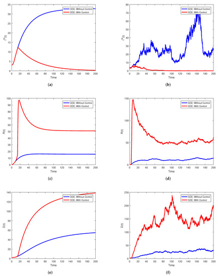 Simulations of for the stochastic model (1) with its corresponding deterministic version, both with and without control. (a) in the case of the deterministic model both with and without control. (b) in the case of the stochastic model both with and without control. (c) in the case of the deterministic model both with and without control. (d) in the case of the stochastic model both with and without control. (e) in the case of the deterministic model both with and without control. (f) in the case of the stochastic model both with and without control.