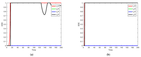 We give some numerical simulations in order to illustrate the theoretical results obtained in this paper. We devised a technique for System (1) using the stochastic Runge–Kutta method of fourth order. The discretization transformation takes the form:
