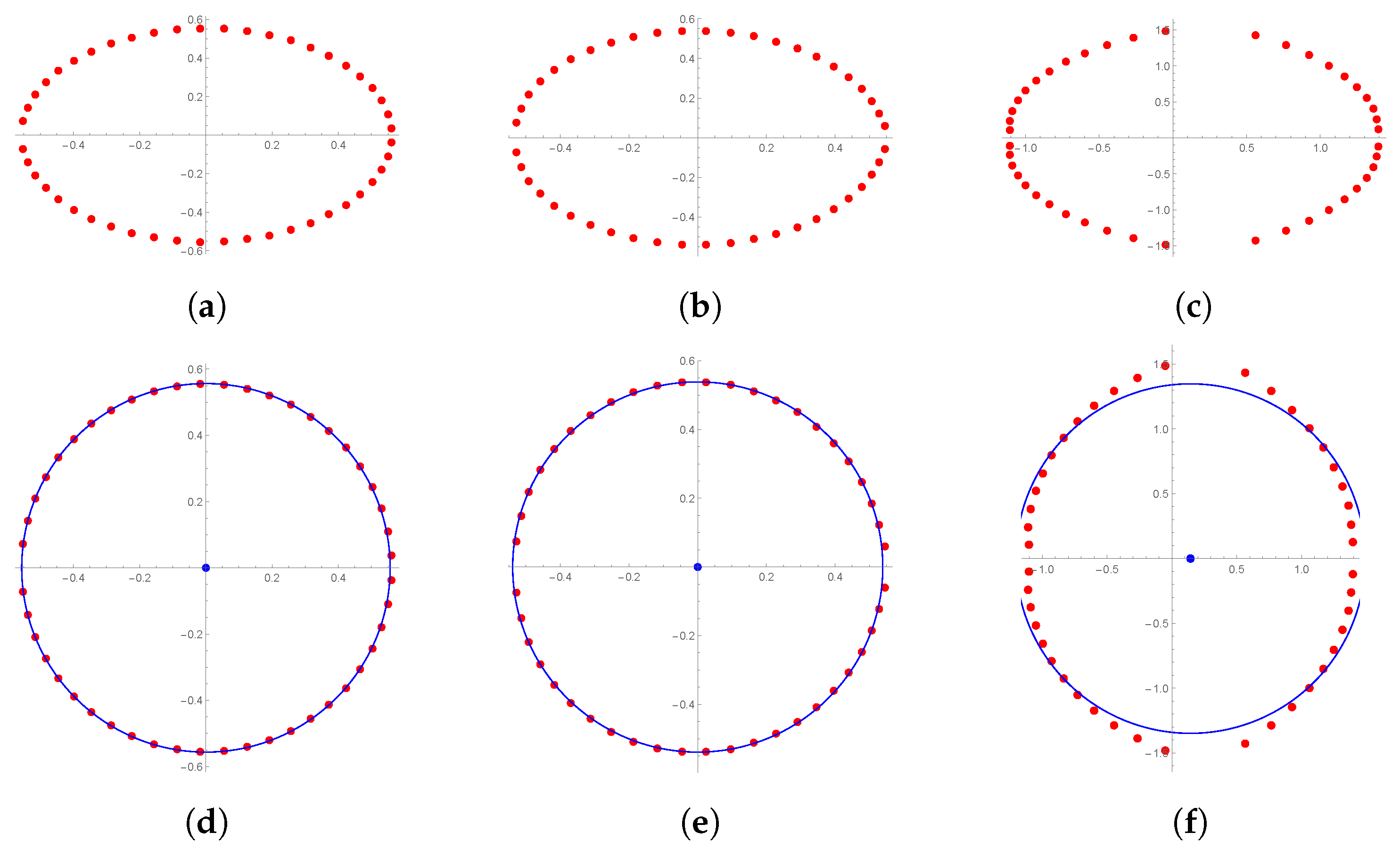 , the blue dots are the circle’s centers, and the blue lines represent the circles closest to the approximate imaginary roots. The lower left figure (d) in