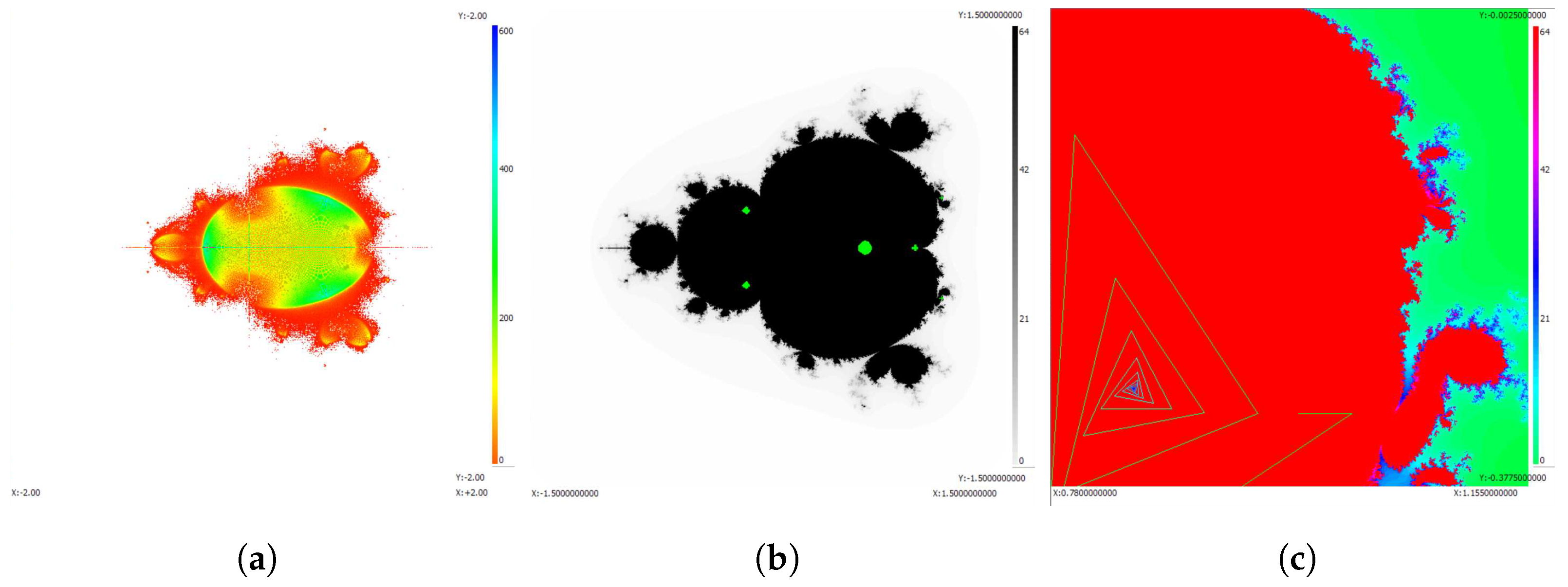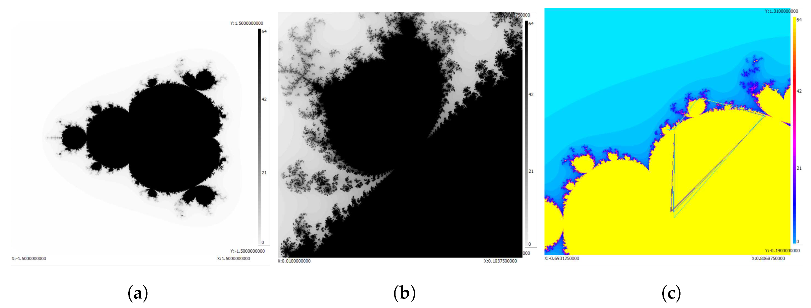 , the maximum iteration is 64, and the convergence range of figure is 2. The red color shows low iterations and the blue color shows the 64th iteration.