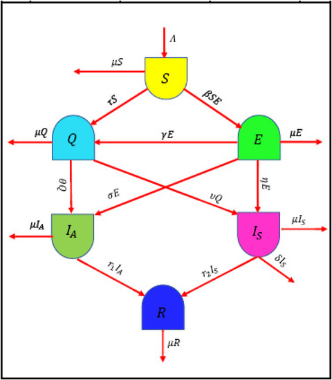 Assume that and are the natural human natality and death rates, respectively. becomes infected after contact with or migration to at a rate of . may be the first to be moved to or they may get sick without displaying any symptoms or with rates of , and , respectively. Individuals who have been quarantined (Q) may also be confirmed infected through a test with symptoms or without with rates v and , respectively. The persons in may recover at the rate and the persons in may recover at the rate of [15].
