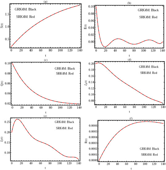 The goal of this subsection is to demonstrate the accuracy and reliability of the numerical values acquired through the GRK4M. Clearly, the comparison is carried out for the values of the numerical solution in the interval by using the GRK4M with the standard RK4M (SRK4M) at the order of the fractional derivative and , with , where in this case, . This verification is suggested in Figure 2, which shows that the current results are in excellent accord with those obtained by the SRK4M. This also confirms that the proposed method (GRK4M) is good implemented. In addition, the numerical scheme by the introduced method, and the given models (1) and (2) are stable.