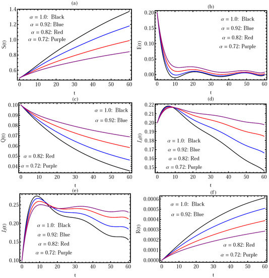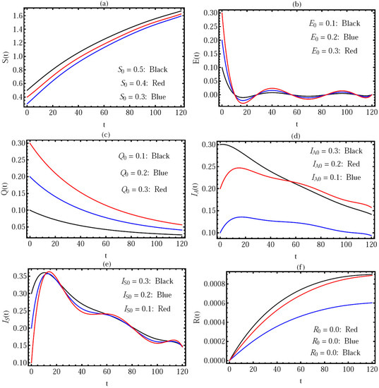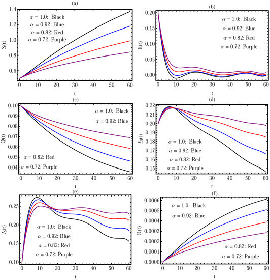 In Figure 4, the solution for all components of the model is presented using the fractional FDM via the same values in Figure 3. From the Figure 3a,b and Figure 4a,b, we can observe that if decreases, the amounts and , respectively, will be reduced. Hence, a small memory of the infection effect maximizes the number of COVID-19 healthy individuals. In Figure 5, the solution via distinct values of the initial conditions with is presented in the interval (), where the components of solution are presented in Figure 5a–f, respectively. There are three cases: