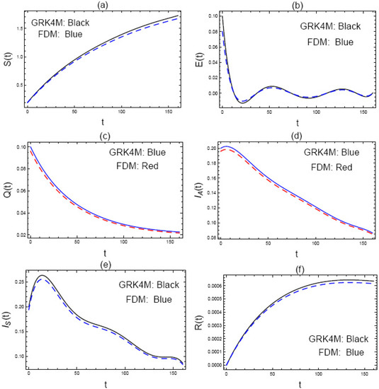 Besides computing numerical solutions with different values of and m, the initial conditions, and the REF, we perform a verification of the proposed approach. We can conclude that the Caputo-operator is a very efficient tool for investigating the numerical solution for the considered model in our study. The method presents an efficient way of investigating the numerical solution for such a model. Additionally, from the presented comparison, we can see the excellent agreement between our numerical solution for the fractional model obtained by using the GRK4M and the numerical solution obtained using the fractional FDM at various values of . In contrast, the numerical analysis of our work provides field meanings. We performed our numerical analysis using Mathematica. Finally, in the future, the authors are interested extending the model with studies of its optimal control and considering different forms to cover all of the affected parameters of the disease as well as the concerned fractional COVID-19 model can also be analyzed.