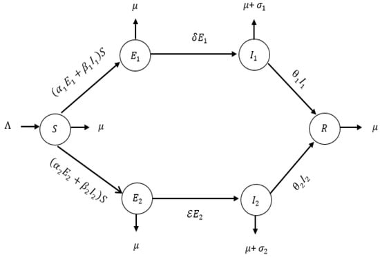 - Ade León, U.A.P.; Avila-Vales, E.; Huang, K.L. Modeling COVID-19 dynamic using a two-strain model with vaccination. Chaos Solitons Fractals 2022, 157, 111927. [Google Scholar] [CrossRef] [PubMed]