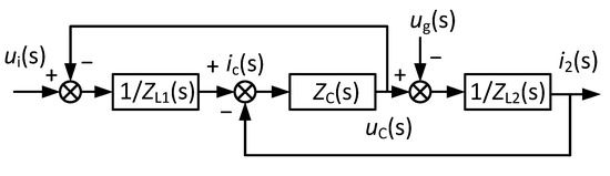 According to Figure 5, the mathematical model of the LCL-type grid-connected inverter was obtained, as shown in Figure 6. is the transfer function of the modulation wave to the output voltage of the inverter bridge, where is the input voltage and is the magnitude of the triangular carrier. are the impedances of , , and , respectively, and their expressions are in (8). When , as in the IOGCI, the capacitor current proportional feedback had to be used to damp the resonance.