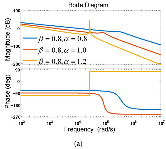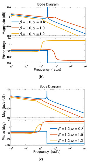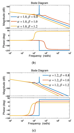As shown from Figure 3 and Figure 4, when , , and (for example, the combination of and was (0.8, 1.2) or (1.0, 1.0)), the magnitude–frequency characteristic of the FOLCL filter had a resonant peak, and the phase–frequency characteristic had a −180° phase jump. When and (for example, the combination of and was (1.2, 0.8)), the magnitude–frequency characteristic of the FOLCL filter had a resonance peak, and the phase–frequency characteristic had a +180° phase jump. When (for example, the combination of and was (0.8, 0.8), (0.8, 1.0), (1.0, 0.8), (1.0, 1.2), (1.2, 1.0), or (1.2, 1.2)), the FOLCL filter showed no resonance peak. The resonant frequency measured from the figure was = 28,900 rad/s, which was basically equal to the theoretical value ( = 28,867.5 rad/s). It was also proved that the resonant frequency was independent of the inductor order and the capacitor order and was determined only by the values of , and .