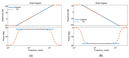 Since the fractional-order differential operator is an irrational function and thus cannot be directly implemented in numerical simulation, the improved Oustaloup filtering method was used to approximate the fractional-order differential operator by integer-order components. According to the fitted transfer function, fractance chain circuit models of the fractional-order inductor and capacitor were built. The operators and were approximated by fractance chain circuits; their bode plots are shown in Figure 11. The Oustaloup filtering method achieved good approximations at interesting frequency bands.