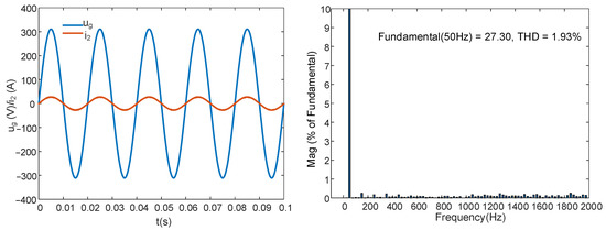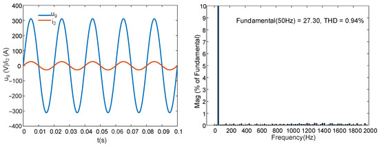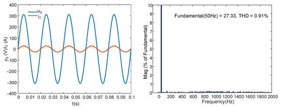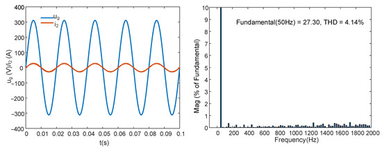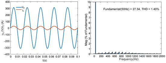 For the FOGCI, the capacitor current proportional feedback was omitted in this case. The inductor order , and the capacitor order (). First, the IOPI controller was used to regulate the grid current; the results are shown in Figure 16. The system was stable without active damping. The RMS value of was 27.38 A, and the THD was 1.26%. Then, the FOPI was employed to control the grid current, and the integral order λ = 0.9; the simulation results are shown in Figure 17. The RMS value of was 27.33 A, and the THD was 0.91%.