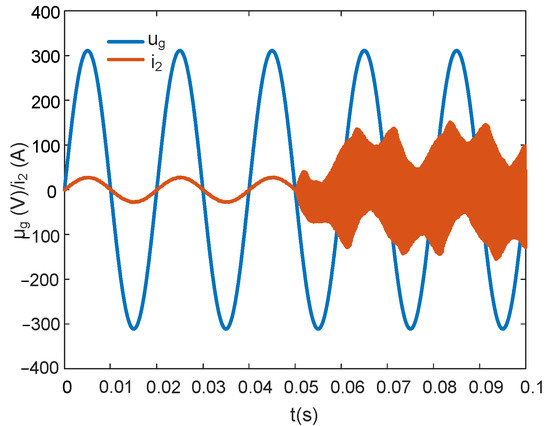 For the FOGCI, α + β = 2 (α = 1.2, β = 0.8), and the IOPI controller was used to regulate the grid current at the beginning. The capacitor current feedback coefficient . When t = 0.05 s, was set to 0, and the system became unstable, as shown in Figure 18.