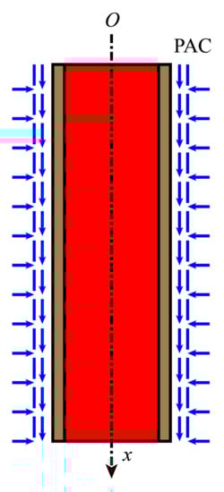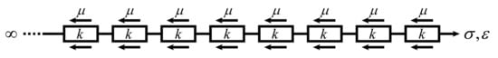 However, the fractals in the literature [,,] are not purely geometric. The structure in Figure 1b is abstracted as follows. A microfiber consists of many molecular chains stacked together. One of the molecular chains is isolated and reduced to a straight chain (Figure 2). The straight chain is embedded in the gel substrate. Once the straight chain is stressed, it will be deformed elastically. The collagen molecule can be regarded as an elastic element with the elastic module k. The interaction between collagen molecules and the gel substrate leads to a shear-lag effect, which can be portrayed by viscous components with the viscosity denoted as . Thus, the transfer of forces and deformations along the straight chain and the substrate can be described by the combination of the two elements.
