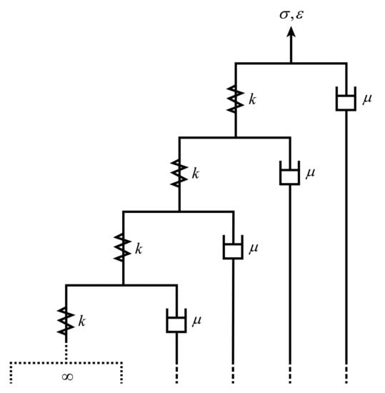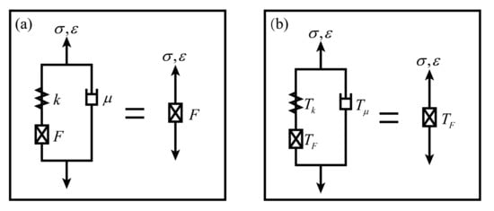 If the fractal tree is checked from a different way, in which one stands on the first elastic element k and looks toward the second level of the structure, then another fractal tree (or another fractal element F) will be found. Thus, the entire fractal tree is equivalent to such a structure that the first elastic element k is connected in series with the fractal element F and then in parallel with another vicious element . The equivalent structure involved with k, , and F, is the fractal cell (Figure 4a).