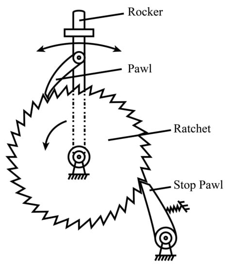 Although the above general proposition can be applied to higher-order topology, for living organisms, the topological index is usually 2, so order should be sufficient. The reason is simple. Living organisms are completely controlled by the number 2; e.g., DNA is a double helix structure; cell division is always divided into two; the vascular tree is two-bifurcation; and the neural tree is also two-bifurcation. In addition, there is also a common movement conversion related to the number 2, e.g., ratchet wheel movement. We found that the ratchet wheel motion in life can be mostly fractal, and its dynamics is mostly 1/2 order fractional dynamics. The ratchet wheel is a motion conversion mechanism in engineering (Figure 5). It is usually used to realize the conversion between two different motions, especially, converting a periodic (reciprocating) motion into a unidirectional (linear) motion. Because the phenomenon of motion conversion is widespread in nature and engineering, ratchet wheel motion has almost been extended to all disciplines. As long as the conversion between periodic motion and unidirectional motion is involved, there exists a ratchet wheel principle.