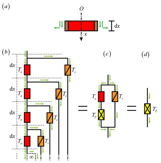 The PVS is divided into an infinite number of identical microcells along the axial direction. Similar to the literature [], the physical elements controlling the flow on each microcell are examined to clarify the flow control operators. The control operator for axial flow per unit length is , and the control operator for radial flow is . Then, on each microcell, the operators and are connected in parallel with each other. Then, based on the continuity of flow between two adjacent microcells, the element (operator) fractal tree can be refined (Figure 8). It is noted that the fractal tree in Figure 8, with a topological index of 2, is both identical to the topology of the fractal tree in the literature [] and identical to the topology of the fractal tree in Figure 3. The completely different subjects studied show complete consistency.