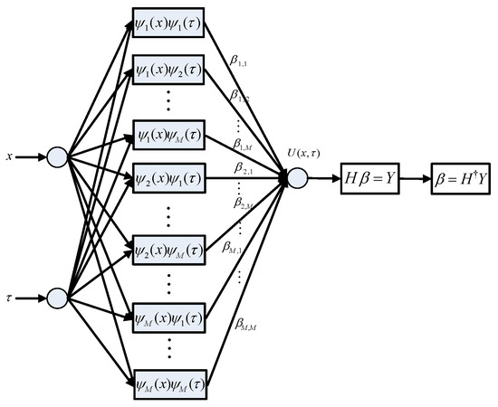 | Input: , , , , , ⋯, , , ⋯, Step 1: Constructing a numerical solution by the Legendre wavelet as the activation function, that is . Step 2: Substituting the numerical solution and its derivative into the PDEs, the initial condition, and its boundary. Step 3: Solving by ELM and obtaining the network weights , . Step 4: To obtain the numerical solution . |